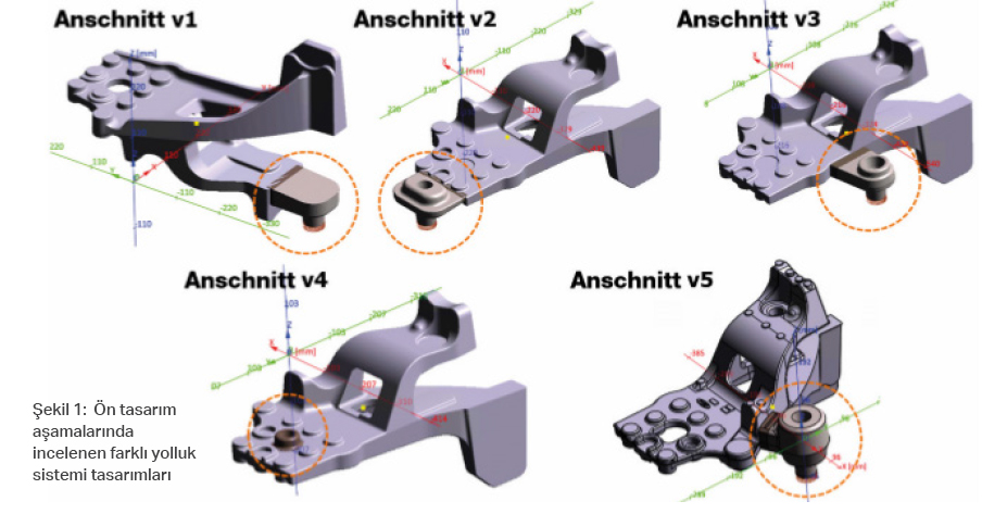 Döktaş mühendislerinin proje hedeflerine ulaşmasındaki temel zorluk, parçanın homojen olmayan et kalınlığıydı. Bu du- rum, uzun ve homojen olmayan katılaş- maya neden olarak besleme sorunlarına neden olabilir ve sonuçta çekinti hataları- na yol açabilirdi. Bu nedenle, Döktaş mühendislik ekibi beş farklı yolluk sistem seçeneği tasarladı ve MAGMASOFT® otonom mühendisliğini kullanarak bunları karşılaştırdı.