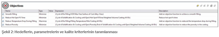 İlk proje aşamasında, döküm parça ve kalıp tasarımı için söz konusu beş yolluk alternatifi ayrı ayrı değerlendirildi. Yolluk- ların verimliliğini analiz etmek için, aşağı- daki MAGMASOFT® kalite kriterleri kulla- nılarak farklı hedefler sistematik olarak değerlendirildi: ‘Düzgün Dolum’, ‘HotSpot FSTime”ı az olması’, ‘Dolum Sırasında Sı- caklık düşüşünün az olması’ ve ‘porozite- nin az olması’.