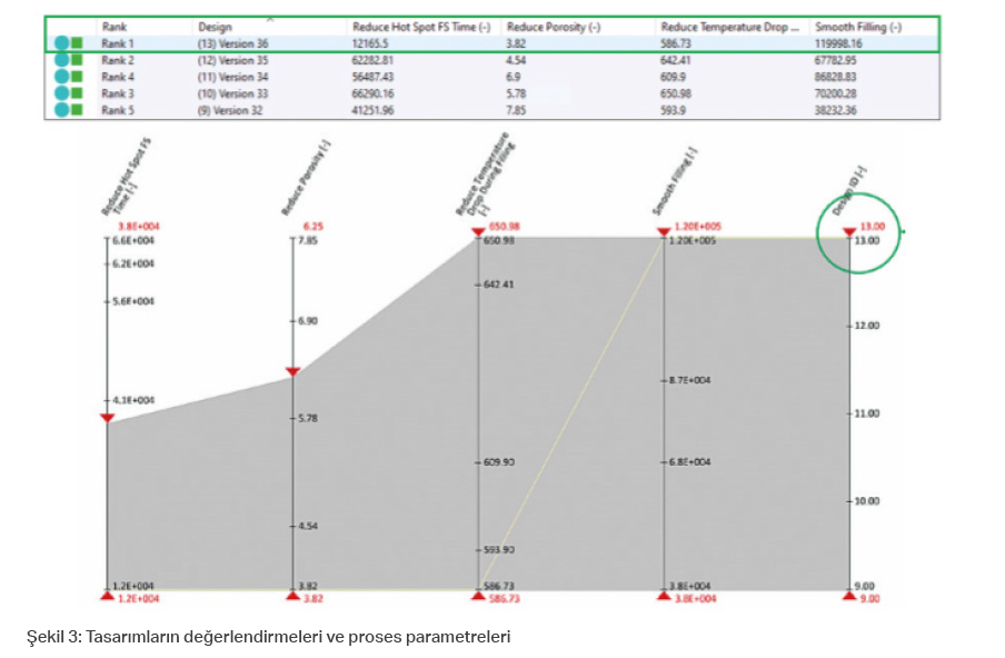 Optimizasyon çalışması, bu kriterler he- def olarak dikkate alınarak yapıldı. Ek ola- rak, gerekli mekanik özellikler de hedef olarak tanımlandı ve ana hedefler olarak ‘HotSpot FSTime”ı az olması.’ ve ‘porozi- tenin azaltılması’ öncelikleri belirlendi. Tüm tasarım seçenekleri ana hedeflere göre değerlendirildikten sonra, en iyi ta- sarım olarak MAGMASOFT® analizindeki tasarım 13 olan 5. Yolluk Sistemi seçildi.